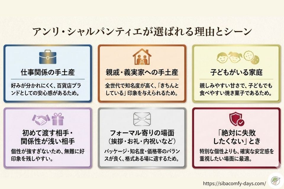 アンリ・シャルパンティエは、仕事関係や義実家など「失敗したくない手土産」を選びたい場面で安心な定番です。