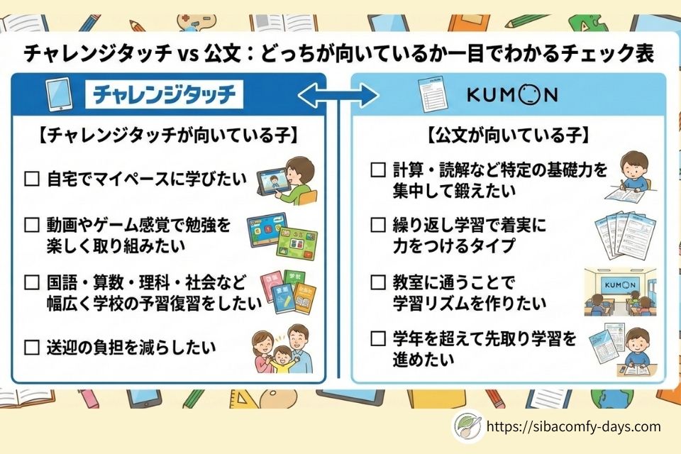 チャレンジタッチは「幅広く楽しく学びたい子」に、公文は「基礎を徹底して伸ばしたい子」に向いています。